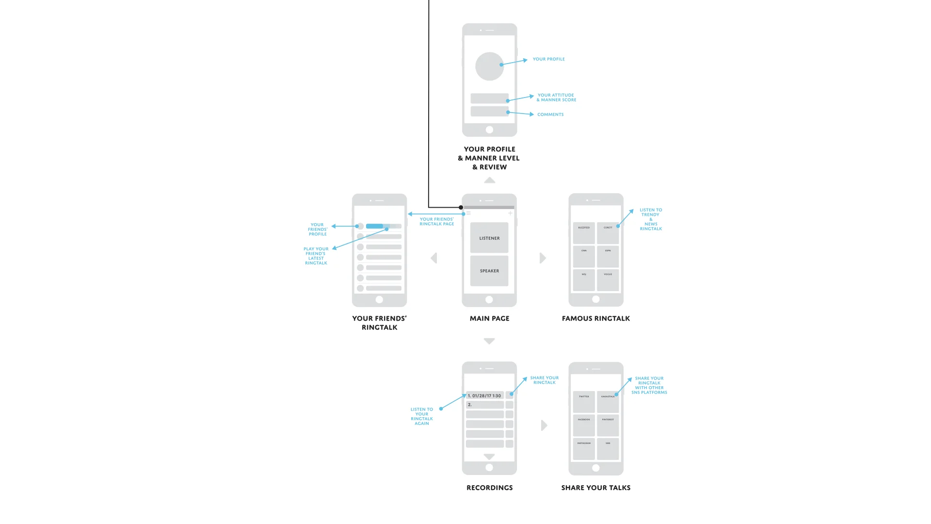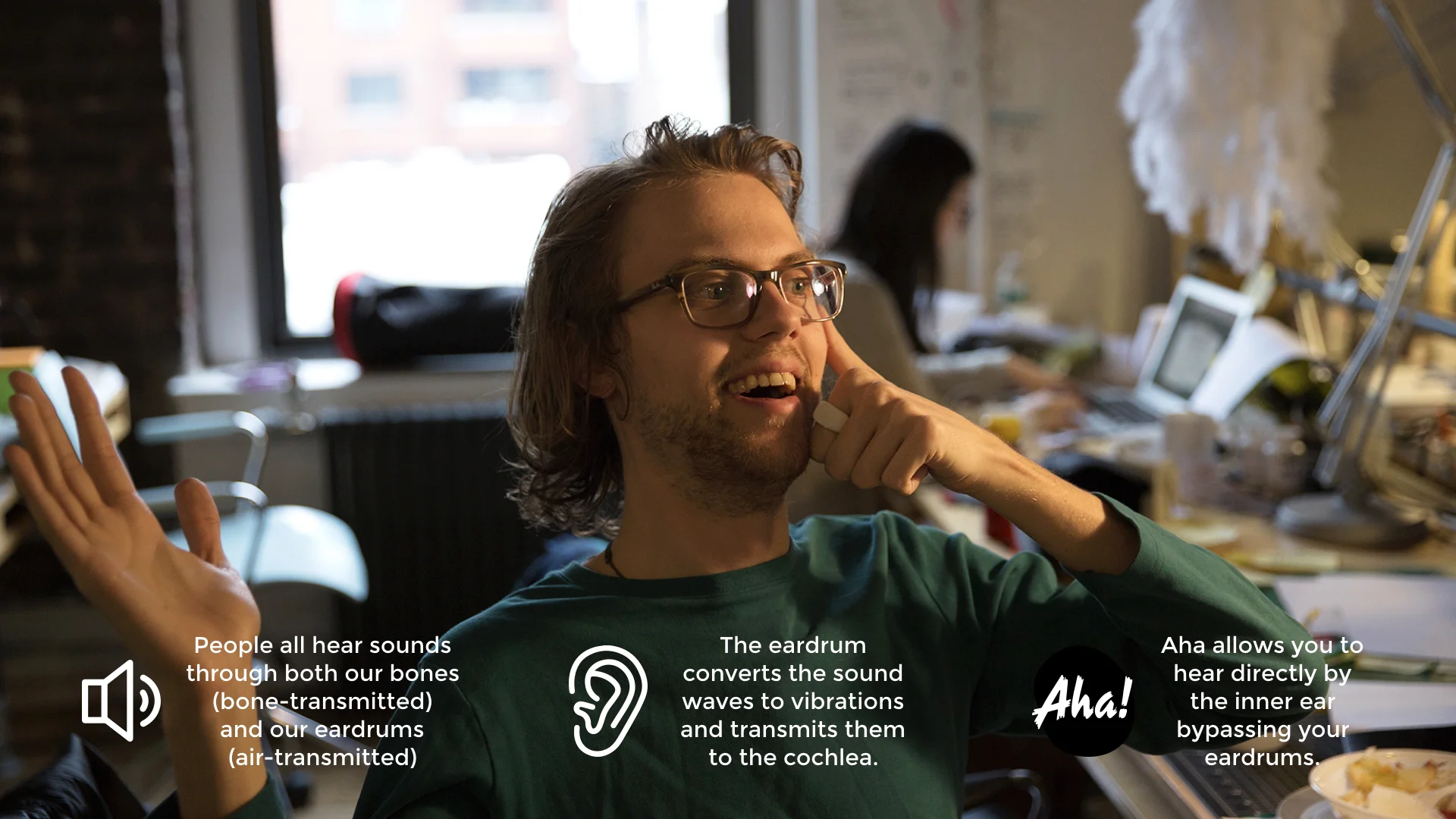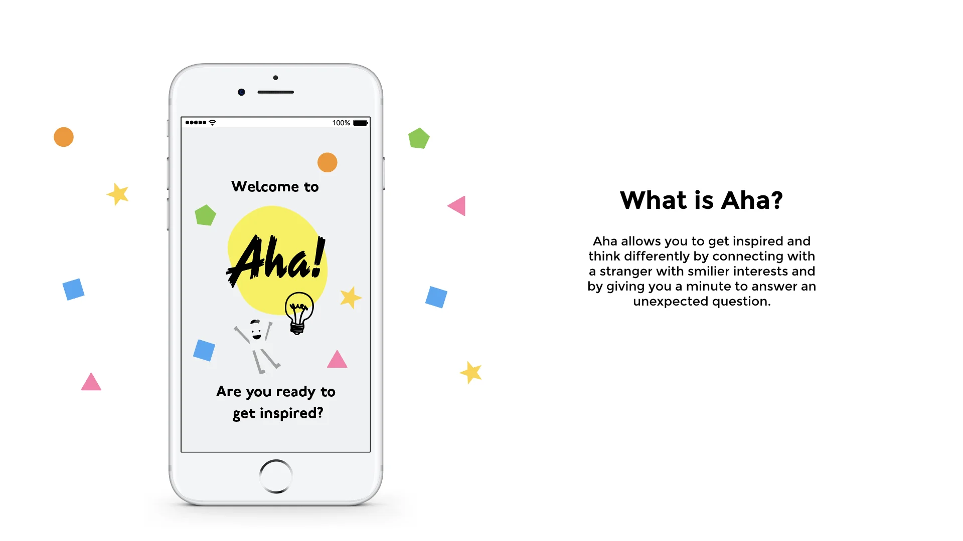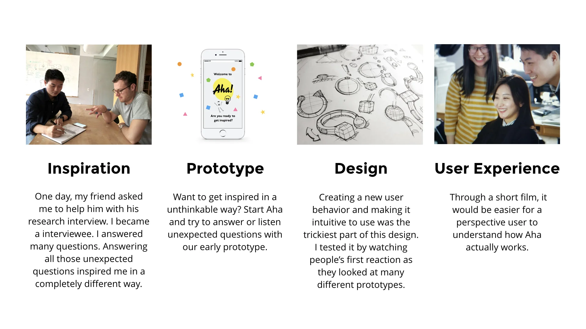 Aha is a social platform that connects people with the inspiration that they want in their everyday lives. The Aha ring is a smart object designed to work in conjunction with an app platform. People are often too absorbed in their own tasks to consider other matters that might be sources of inspiration. By limiting the user to a five-second "thinking" period and a minute-long answering period, I have designed a space where individuals are forced to think quickly and express their opinion about a predetermined topic. I hope to emulate the spontaneity of an improv environment, which I have experienced to be valuable in the creative context. The value proposition of this app is that users will be challenged by the delineated interaction to think differently and become inspired.